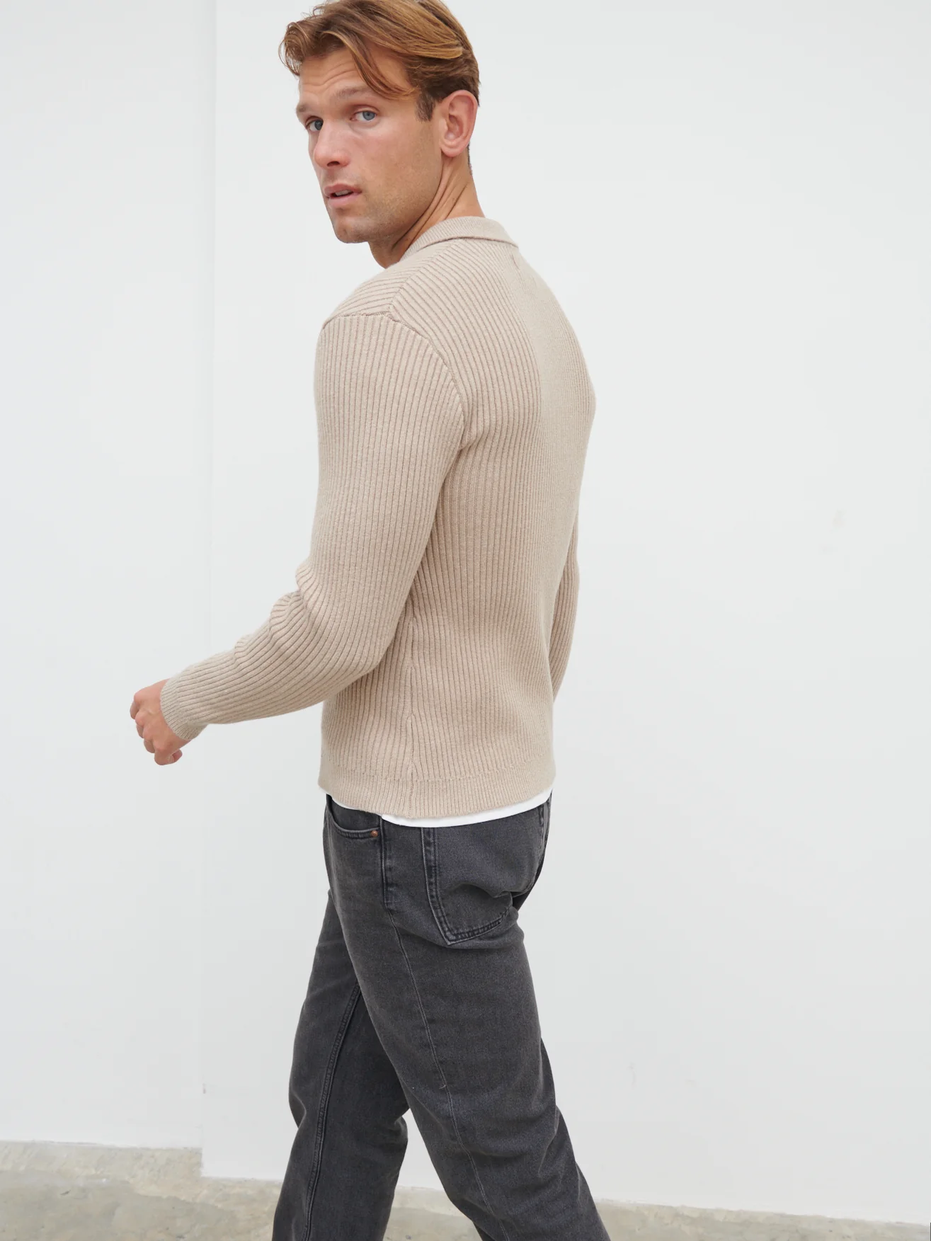 Maxwell Ribbed Knit Long Sleeve Polo - Beige Marl