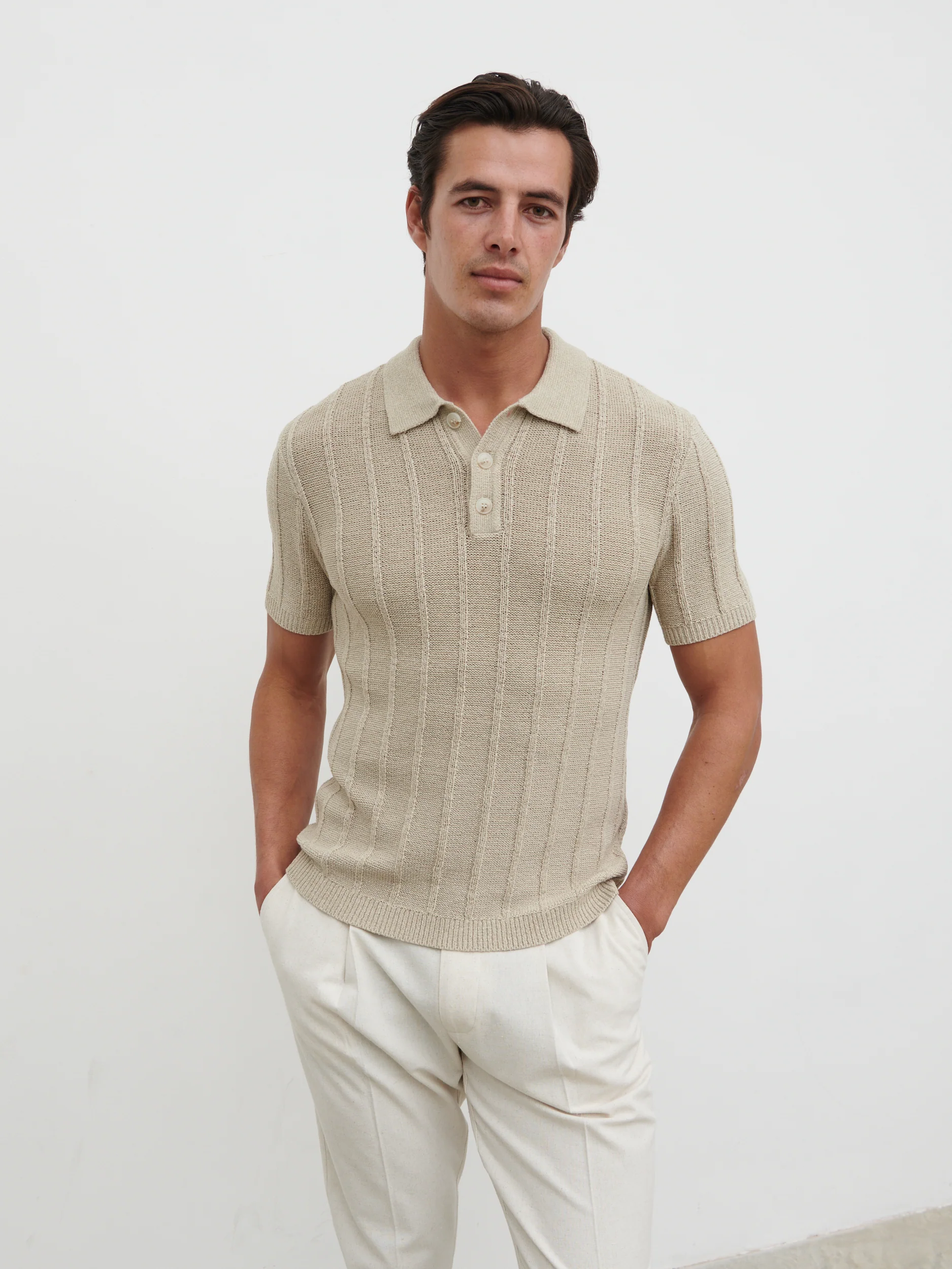 Wesley Fine Tape Stripe Knit Polo - Beige
